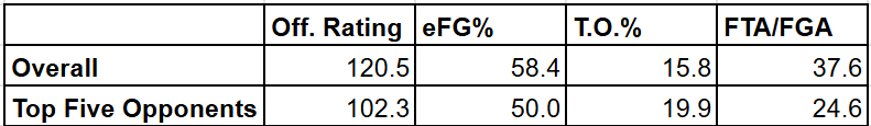 Things didn’t get better against Illinois, either. Here are Iowa’s offensive rating, effective field goal percentage, and turnover rate against the best five opponents on its schedule (Iowa State, Michigan State, Illinois, Minnesota and UCLA) versus its overall ratings: